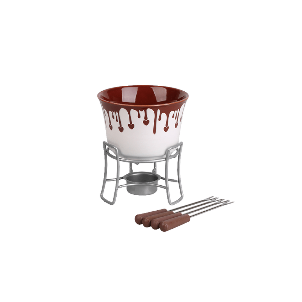 O Conjunto para fondue 6 peças da Brinox é ideal para o preparo de Fondue de Queijo e chocolate. Possui 1 recipiente cerâmico de Ø11,5cm de diâmetro e 7,5cm de altura com a cor externa branca com estampa de chocolate, interna pintura interna marrom. O kit possui uma base em aço inox de ferro com Ø10 com suporte para vela e 4 garfinhos em aço inox com cabos em polipropileno, vermelhos. Torne o clima da sua casa aconchegante com o conjunto para fondue.