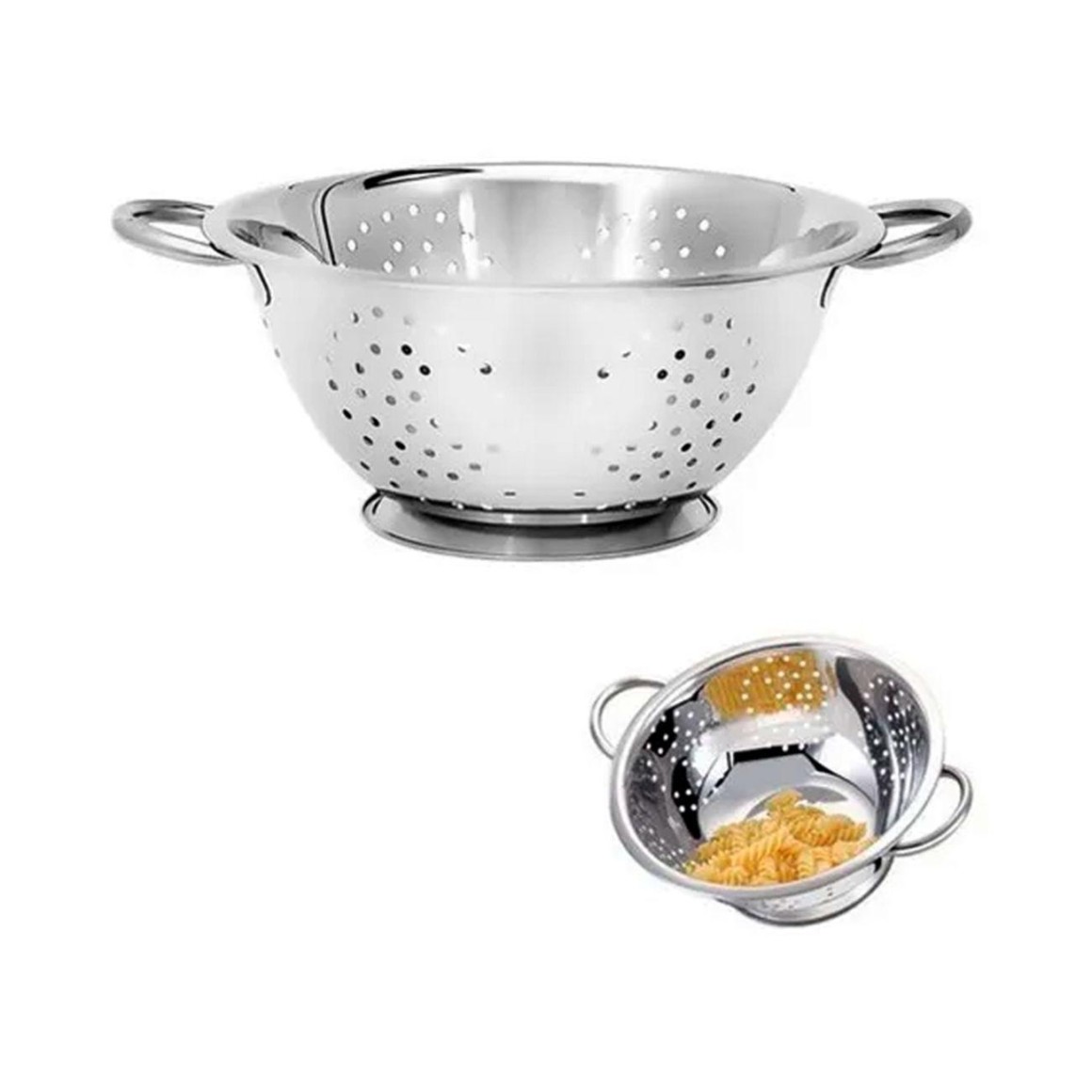 Escorredor de massas, feito em aço inox garante maior durabilidade. Com alças nas laterais facilitar o manuseio na hora de escorrer a massa.