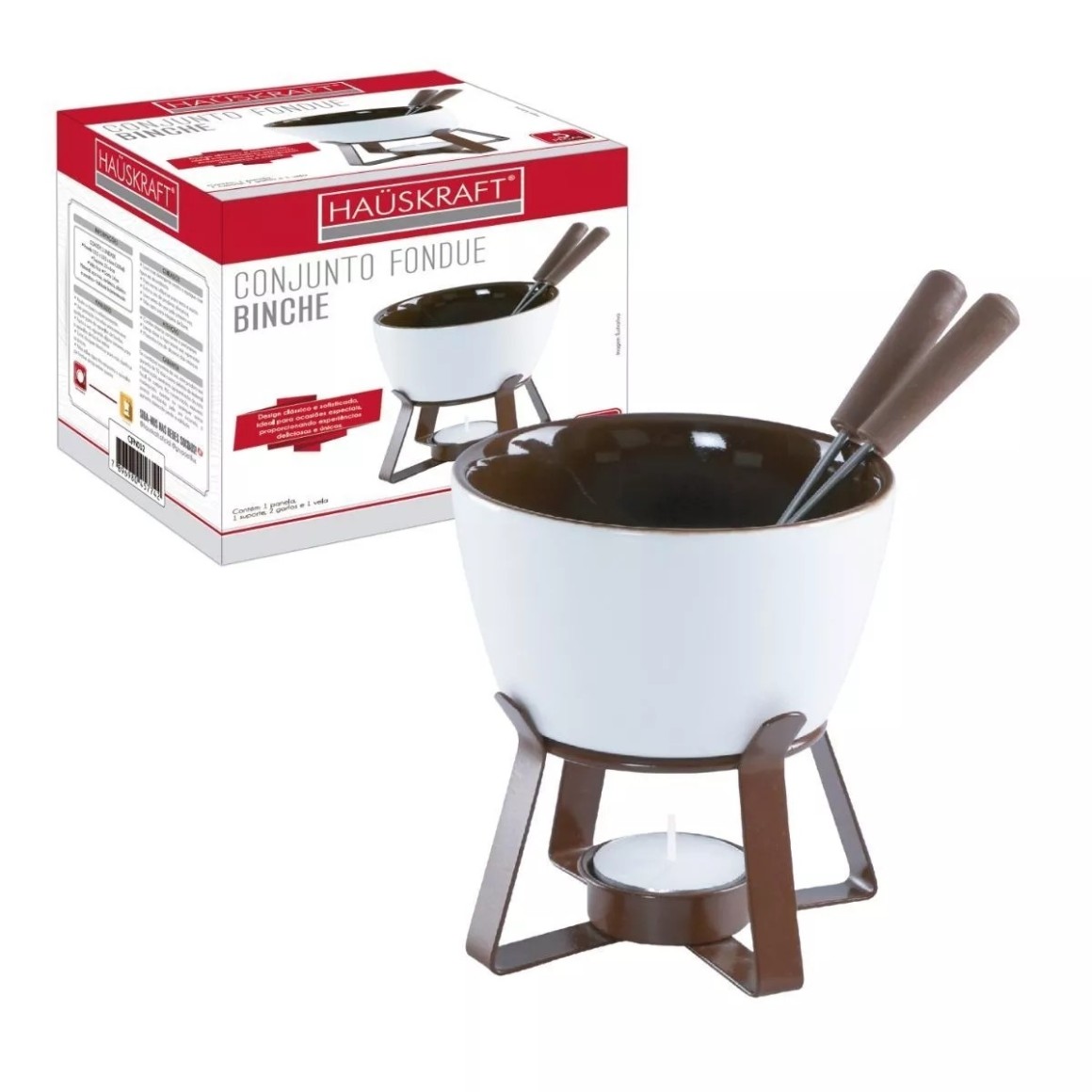 01 Panela cerâmica, 01 Suporte para panela, 01 Vela para fondue, 02 Garfos para fondue