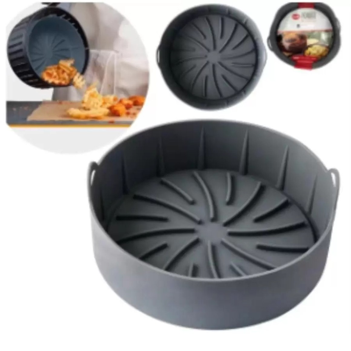 Forma redonda para fritadeira eletrica de siliconeEsta forma em silicone maleável é perfeita para utilizar em suas receitas feitas na Air fryer. Além de proteger seu eletrodoméstico ainda facilita muito na hora de limpar.