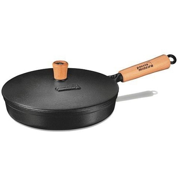 Possui cabo de madeira que é rosqueável e facilmente retirado e colocado, assim retirando o cabo pode-se levar a frigideira ao forno servindo como uma assadeira.