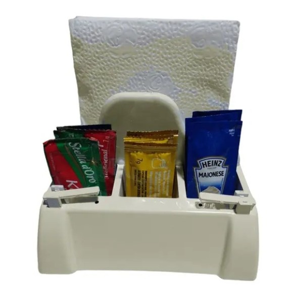 Tem os espaços para armazenar guardanapos e saches, além do exclusico FURA SACHE, dispositivo simples e eficiente, que facilita a vida do seu cliente, dispensando o uso de tesourinhas para abrir os saches.